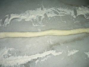 - Once the dough is the correct consistency, sprinkle about 1/4 cup flour onto a clean countertop. Scoop out about 1/4 cup of dough onto counter and roll it into a long ‘snake’, about 1/2″ in diameter. Like this: