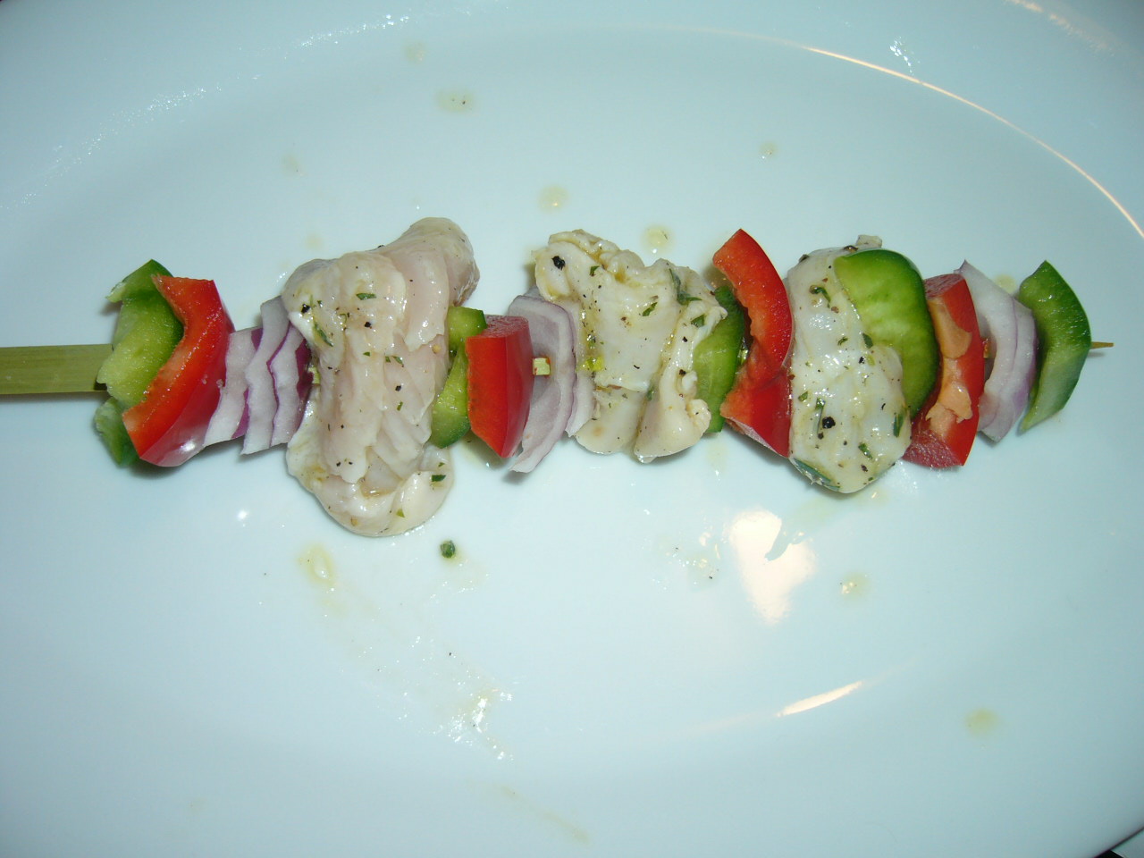 2. To assemble skewers, alternate putting the following ingredients onto the skewers: one piece of green pepper, one piece of red pepper, one piece of onion, one piece of chicken.   Like this: