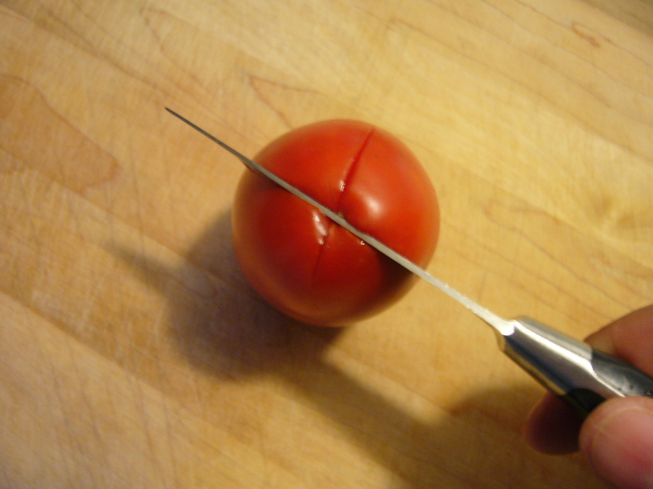 - Using a sharp knife, cut a small sliver from the bottom of each tomato so it makes the bottom flat enough for them to stand upright without rolling over.